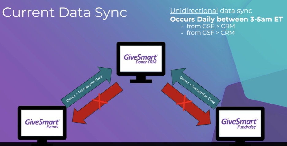 GiveSmart runs the automatic sync each morning between 3:00 and 5:00 a.m. ET. During this time, any new or updated donor and transaction data from GiveSmart Events and GiveSmart Fundraise is transferred to GiveSmart Donor CRM.