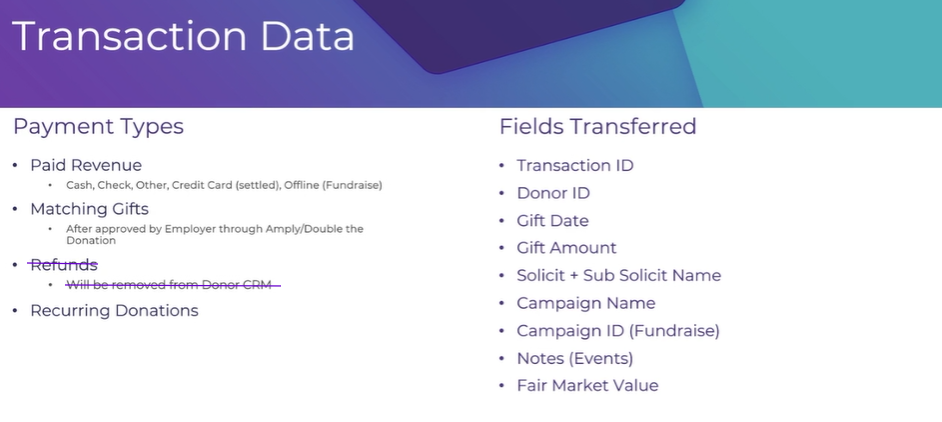 Note: If a transaction is refunded from GiveSmart Events or Fundraise, no changes will be synced to Donor CRM.