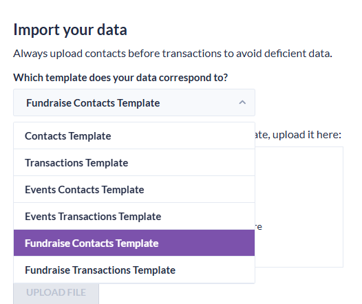 - From the Data Import & Review section, click on Select a Template dropdown in the Import your Data box and select Fundraise Contacts Template