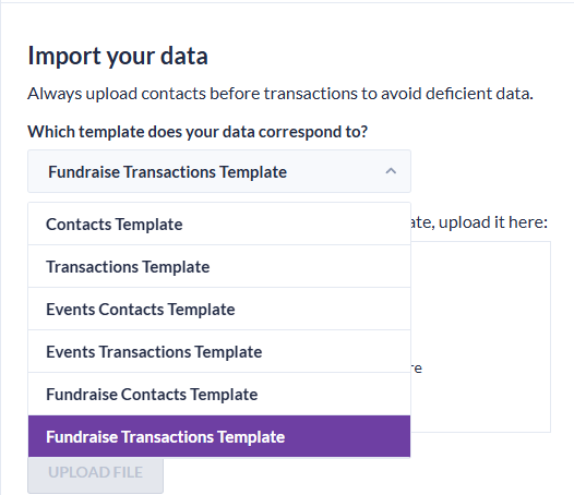- From the Data Import & Review section, click on Select a Template dropdown in the Import your Data box and select Fundraise Transactions Template