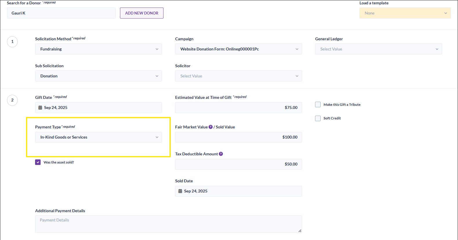 When recording a new gift in Donor CRM, select the Payment Type for In-Kind Goods or Services. Fill in the Gift Date and Estimated Value at Time of Gift.