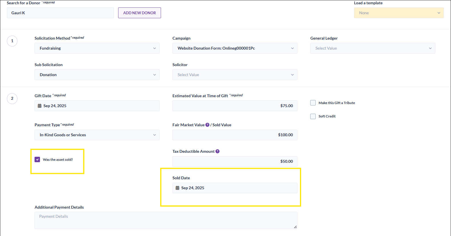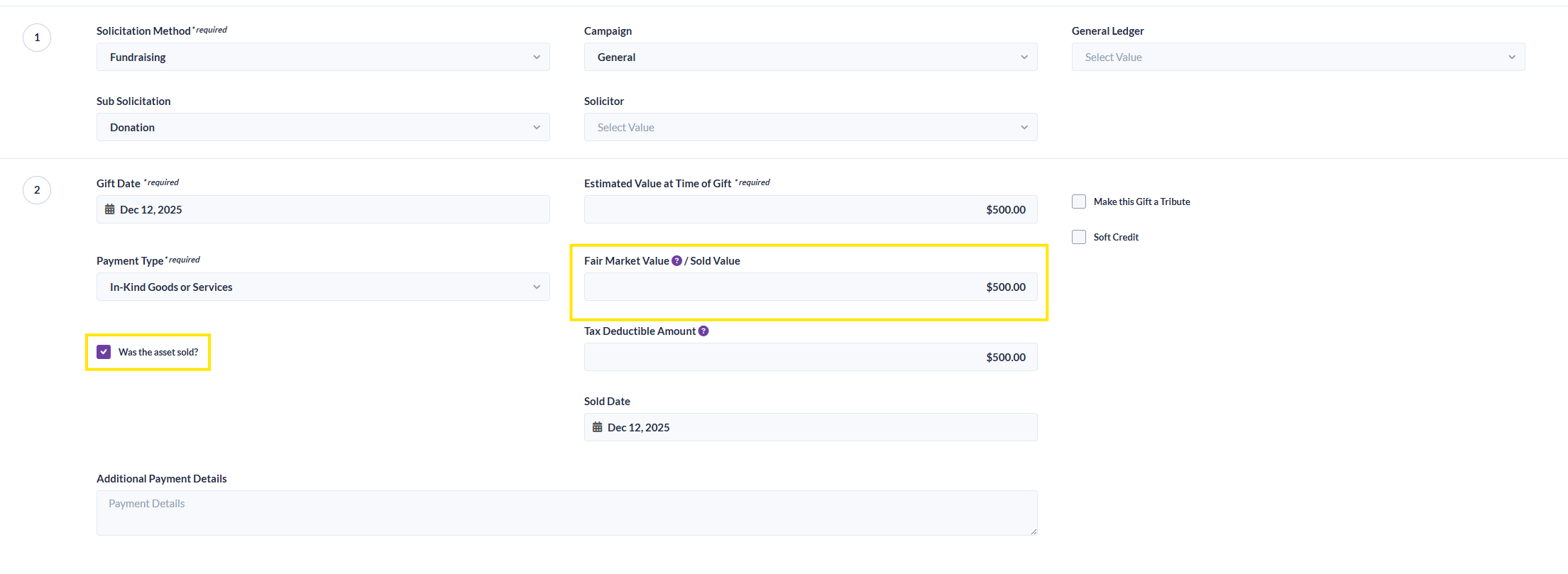 Note: For In-Kind Donations, the Sold Date will be the Gift Date, and the Sold Value will be the Gift Amount in your Gift Listing.
